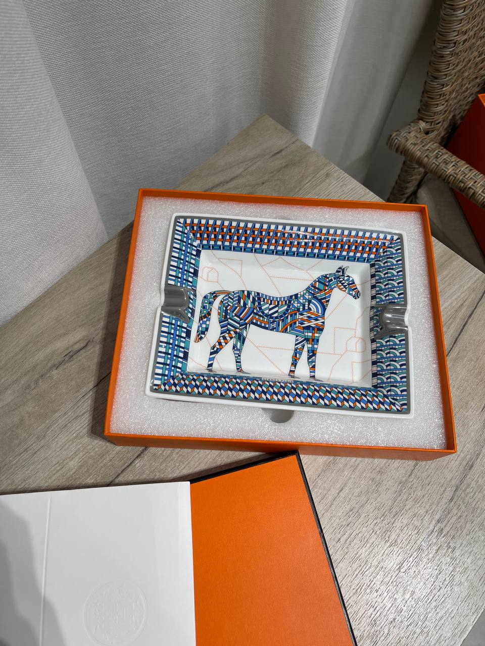 Представляем вашему вниманию изысканную пепельницу Hermes PL-63275, которая станет не просто функциональным предметом, но и элегантным акцентом в вашем интерьере. Эта стильная курительная принадлежность выполнена в прямоугольной форме и украшена оригинальным рисунком лошади в сине-голубой цветовой гамме с геометрическими элементами, что придает ей современный и утонченный вид. Белый фон подчеркивает яркость и выразительность узора, а серые выемки для сигарет гармонично дополняют дизайн.