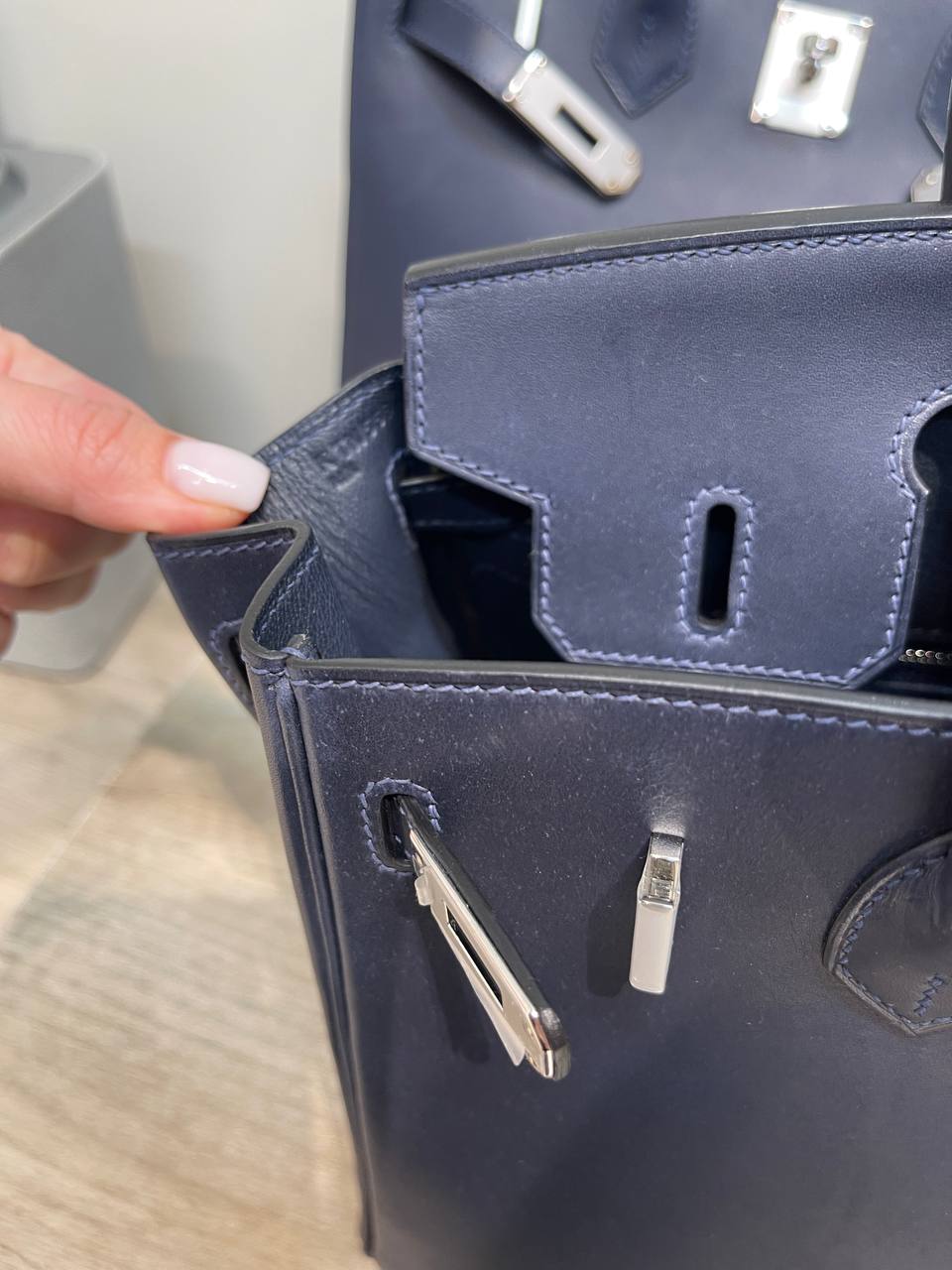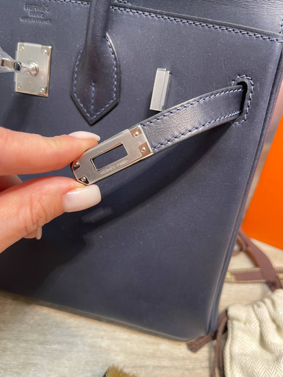 Barenia - редкая высококачественная телячья кожа. Она долговечна, водостойка и не подвержена старению — и хотя с годами на ней могут появиться небольшие потертости и патина, она продолжает выглядеть все лучше и лучше. Центральный штамп с логотипом Hermes Paris не повторяет цвет фурнитуры. Для Barenia он врезан в кожу, что придает ему естественный цвет.
