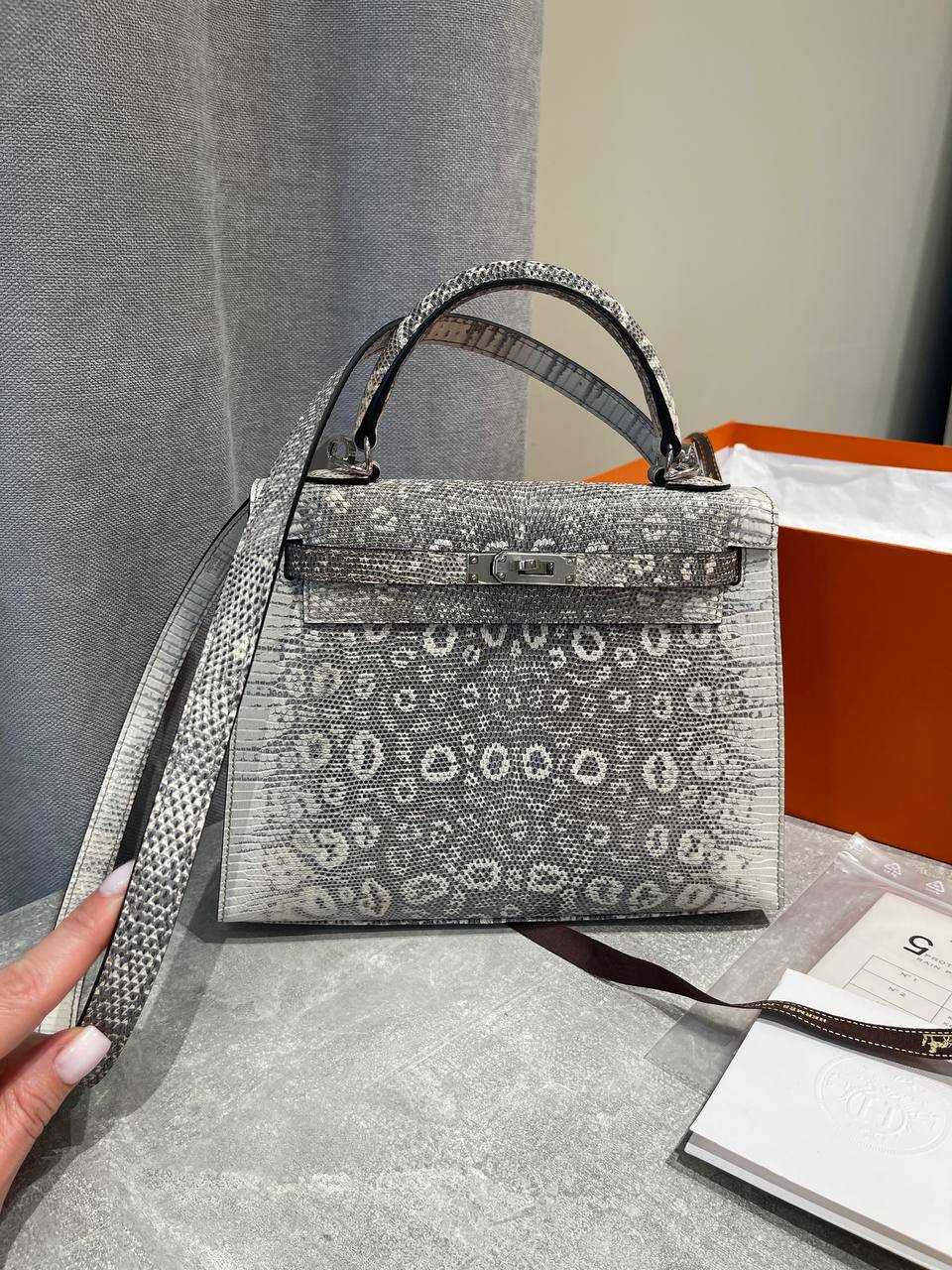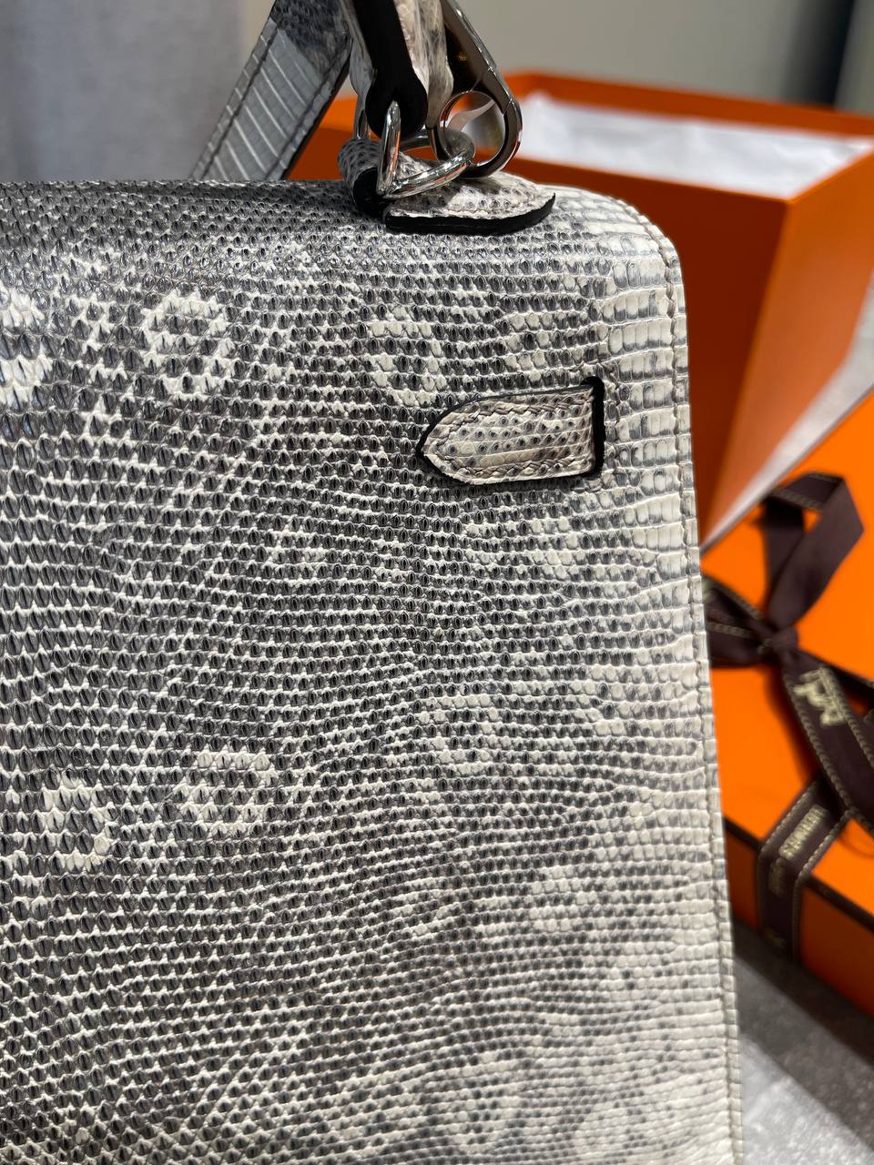 Кожа ящерицы высокого класса. Впервые начала использоваться в 2007 году. Кожа минимально обрабатывается для сохранения натуральной текстуры. В наличии, без лишних ожиданий! Цвет, размер, фурнитура и упаковка сумочки полностью соответствуют оригиналу.