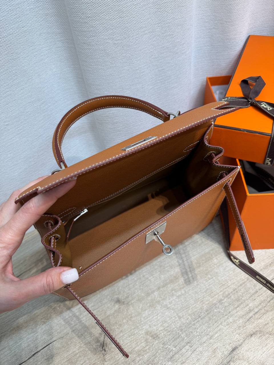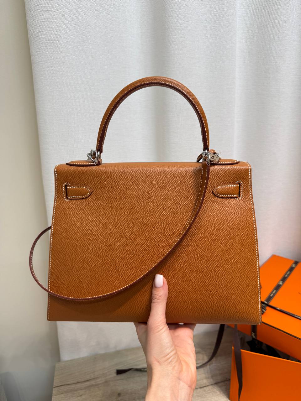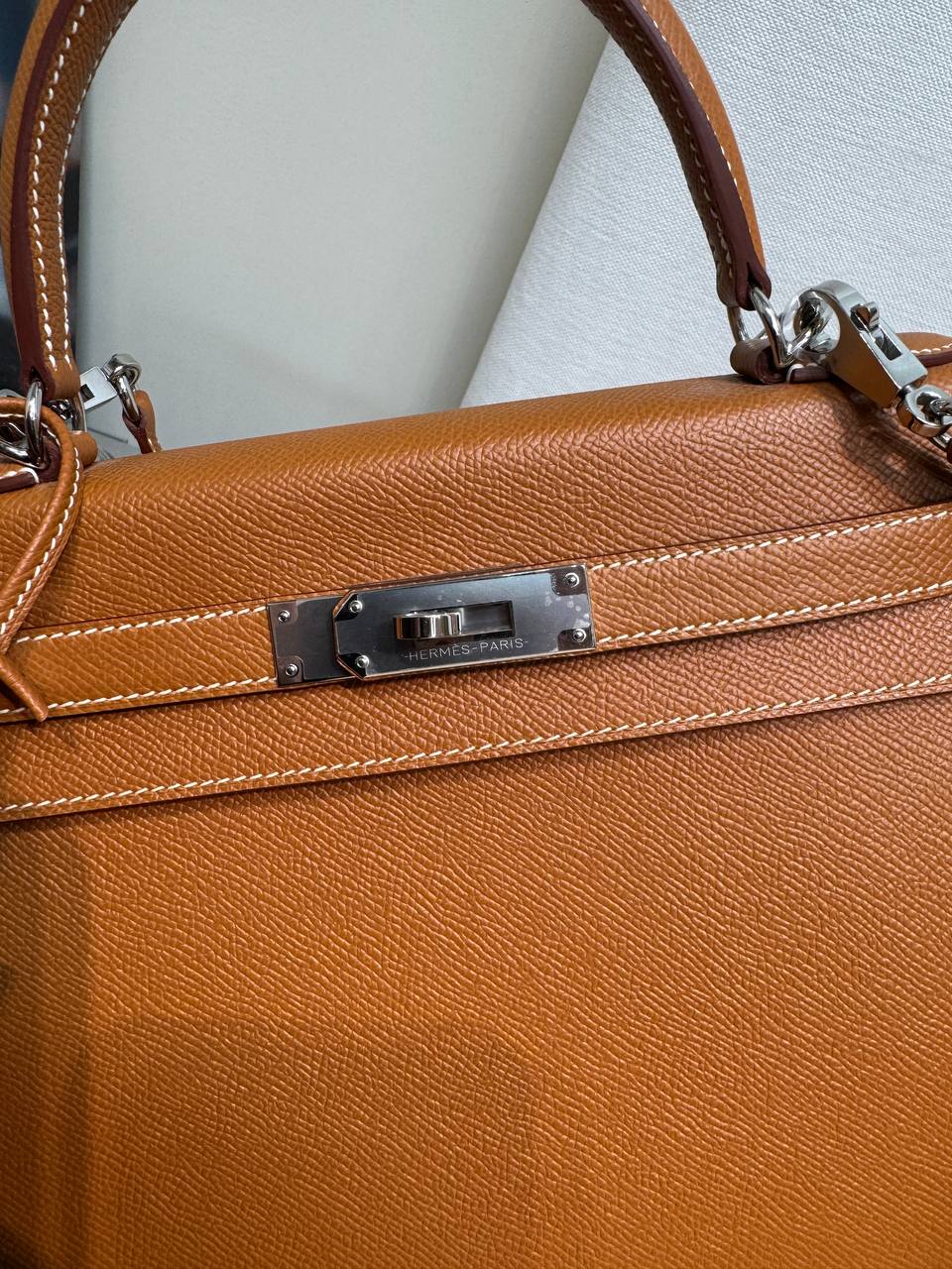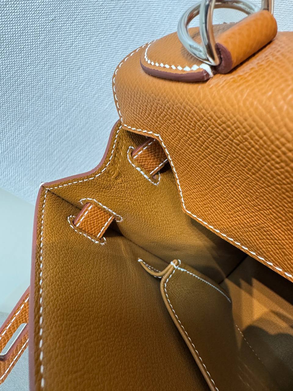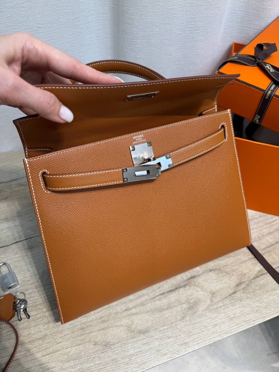 Сумки Hermеs из кожи Epsom легче всего чистить. Кожа крайне устойчива к царапинам и приятна на ощупь. Текстура более гладкая, чем у Clemence.